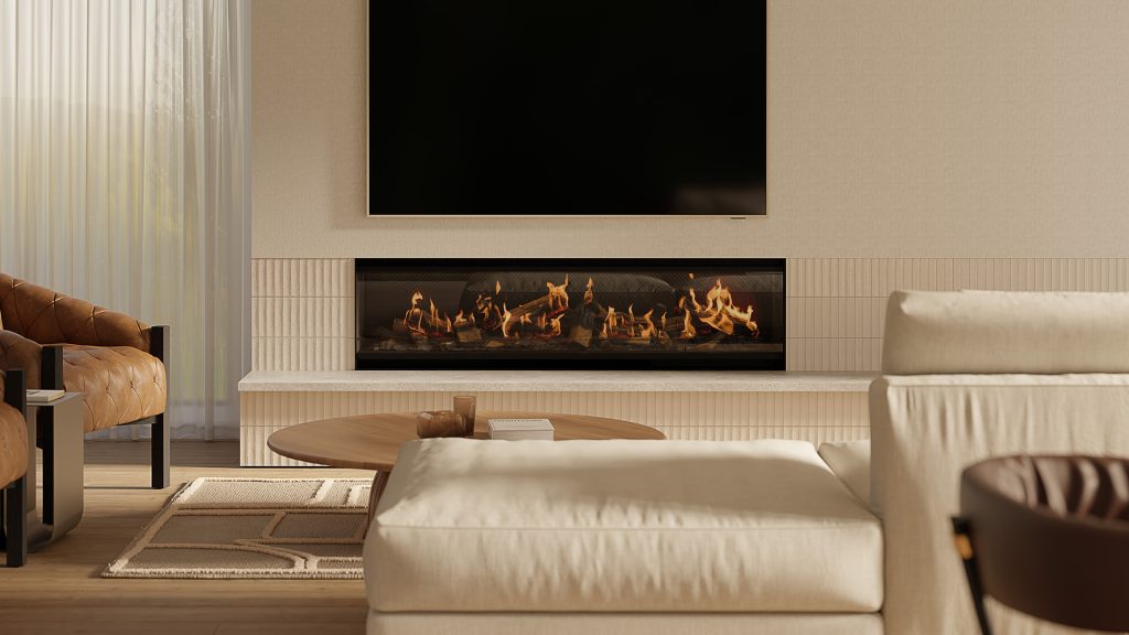 For ideal eye-level display, the Escea LE1550 is best positioned with the base at least 300mm above the floor, secured to a solid, level surface with the supplied mounting brackets. A raised hearth or feature flooring can be added beneath the fireplace opening, allowing full creative freedom—though heat-sensitive materials directly below the viewing area may not be suitable.